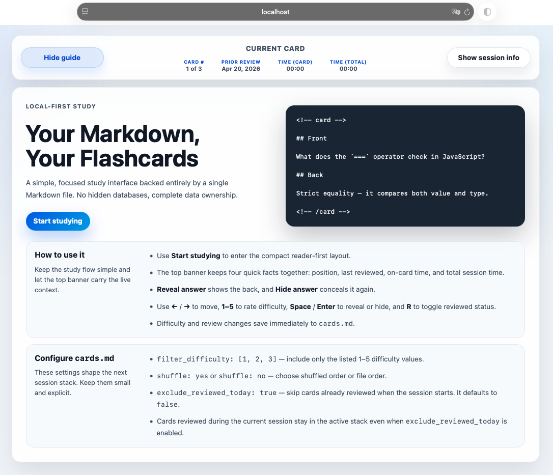 With my Markdown Flashcards, you can write flashcards in plain Markdown, and the app will render them into an interactive study interface. The app also manages metadata like difficulty and review dates, which are saved back into the same Markdown file.