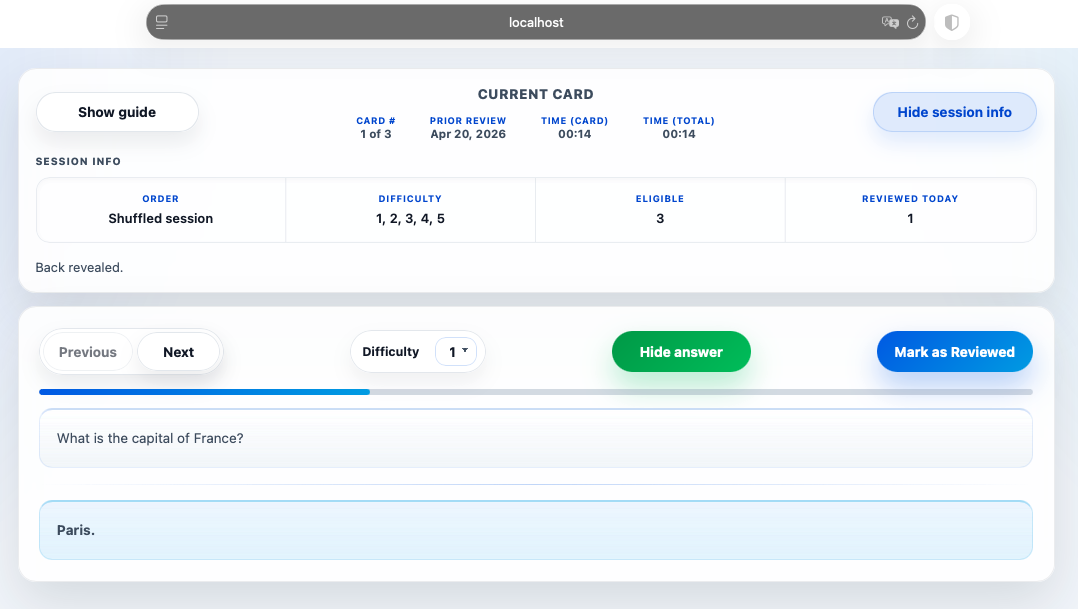 id— stable card identifierdifficulty— current 1–5 ratinglast_reviewed— last date the card was marked reviewedpaused— useyesto remove a card from sessions without deleting it